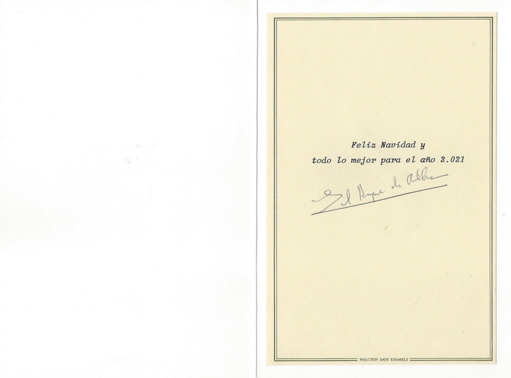 The reply is in the form of a card which on the front is a portrait of Mary and Baby Joseph and inside is a message in Spanish and it is hand signed by The Duke.