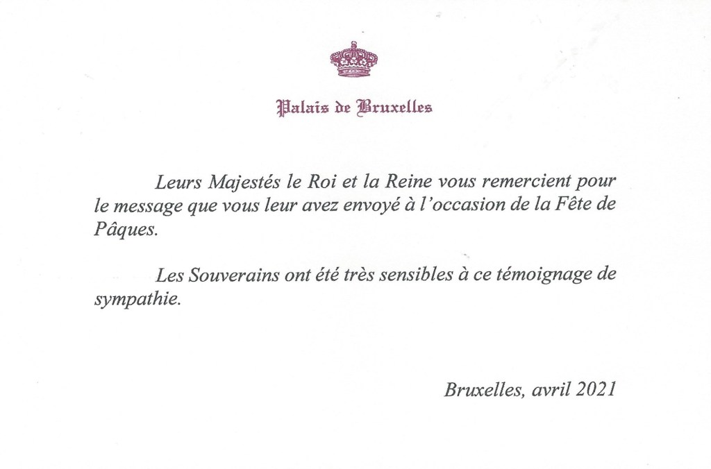 Royal response from their Majesties the King and Queen of The Belgians for Easter 2021.