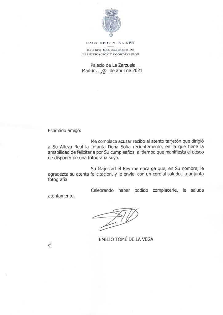 I am pleased to acknowledge the attentive card that the Infanta Doña Sofía recently addressed to her Royal Highness, in which she has the kindness to congratulate her on her birthday, while she expresses the desire to have a photograph hers.