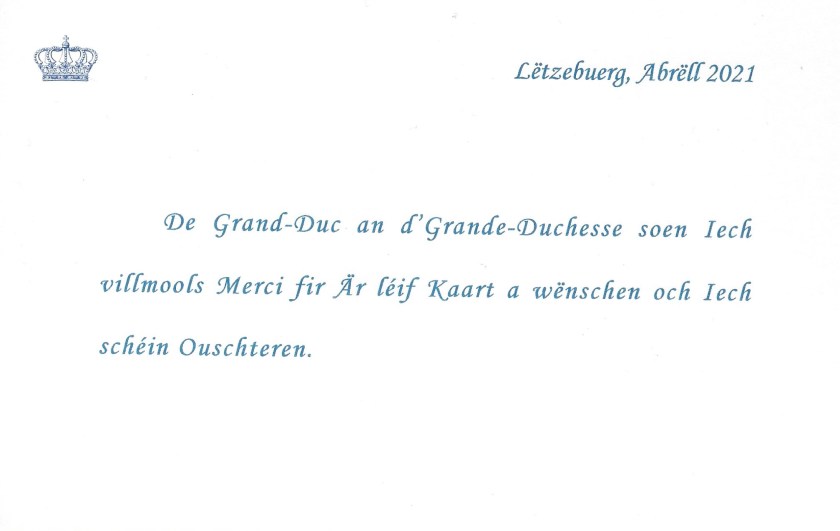 The reply is in the form of a card in Luxembourgish and thanks me for my Easter wishes.