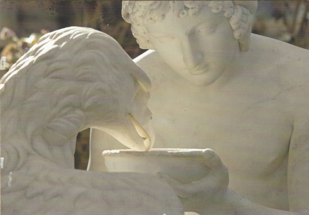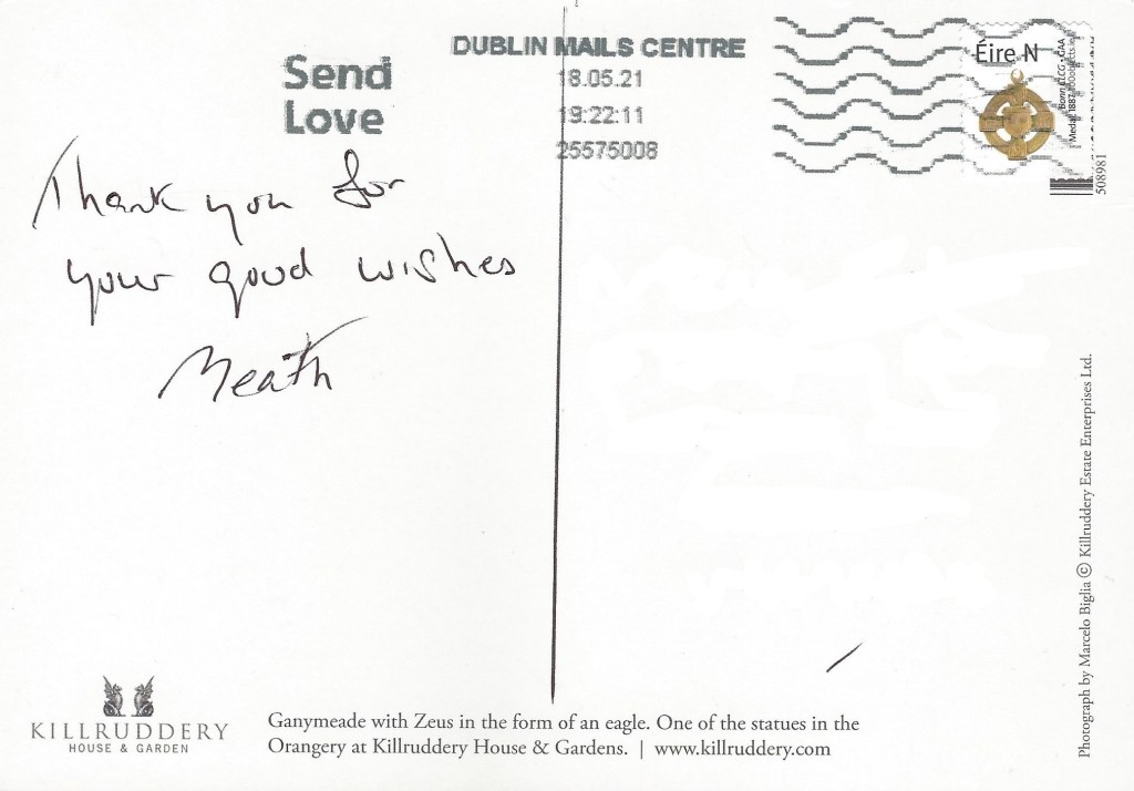 The reply is in the form of a postcard which features a statue of Ganymeade with Zeus in the form of an eagle, one of the statues in the Orangery at Killruddery House and Gardens.