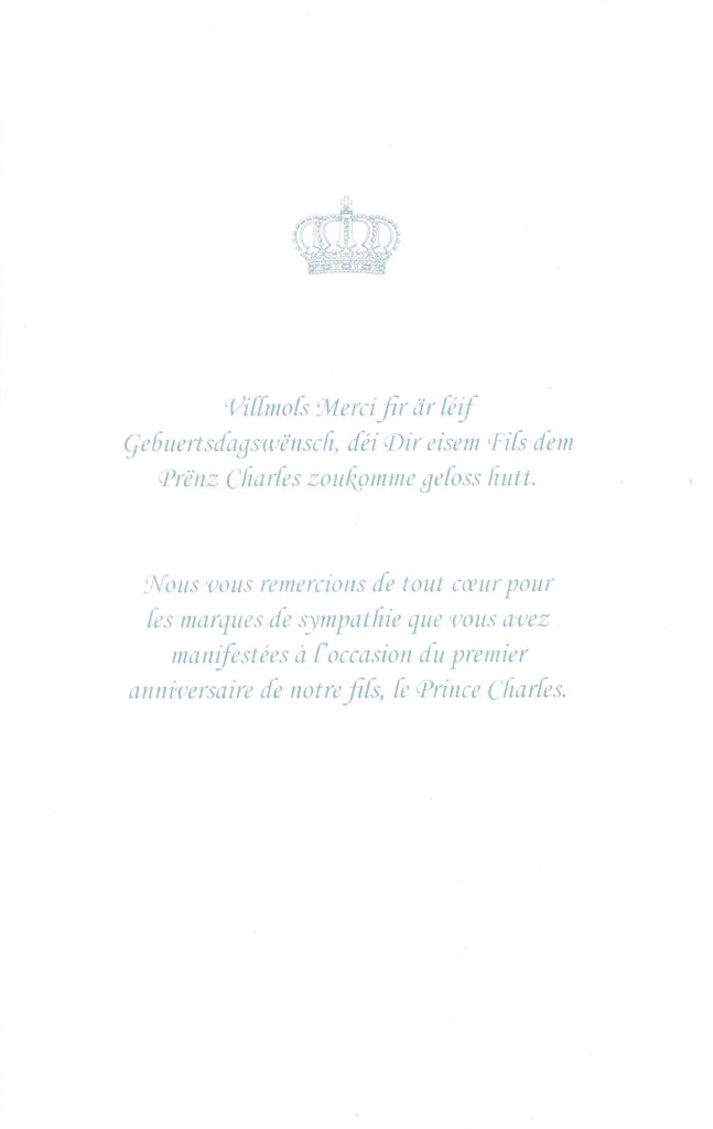 The reply is in the form of a card which on the front bears the Crest of The Royal Family of Luxembourg, inside is a picture of His Royal Highness Prince Charles which was released on his 1st birthday and a message in Luxembourgish and French thanking me for my good wishes on his 1st birthday.
