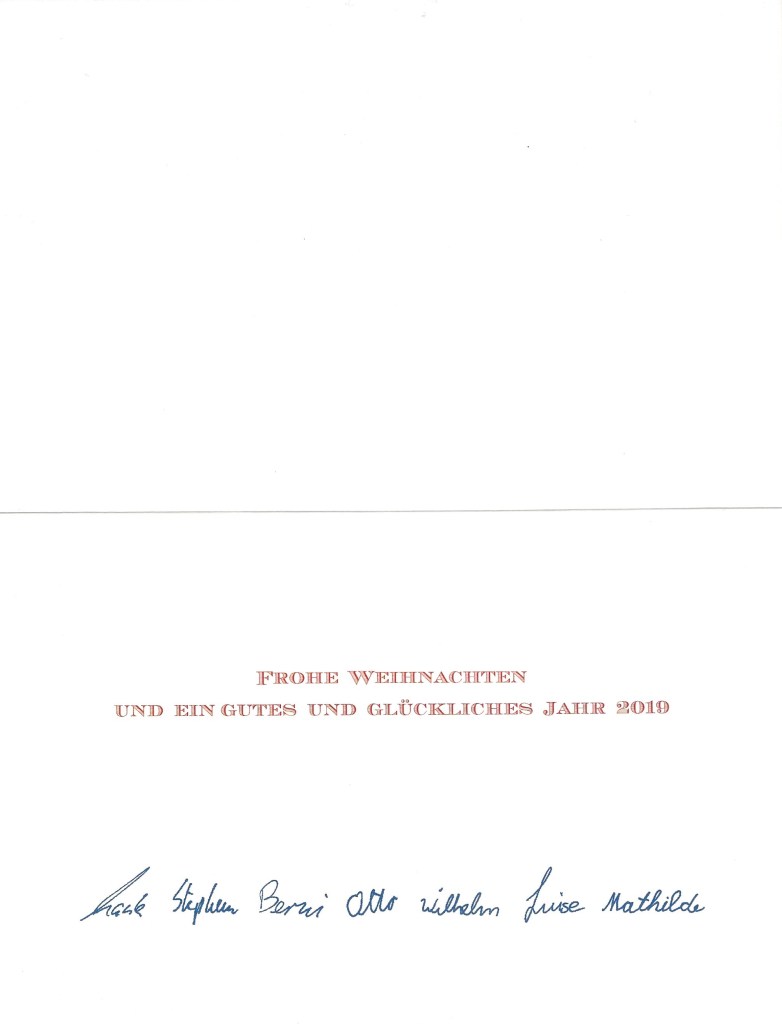 The reply is in the form of a card which on the outside has a picture of The Family and inside is a message in German and the signatures of Their Serene Highnesses.
