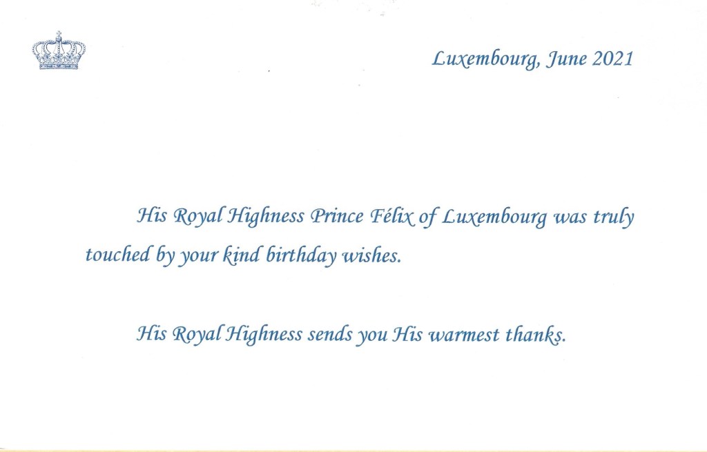 Royal response from His Royal Highness Prince Félix of Luxembourg on the occasion of his 37th birthday.