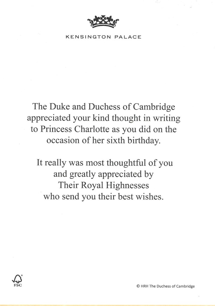 The reply is in the form of a card which on the front features a picture of Her Royal Highness taken by her mother Her Royal Highness The Duchess of Cambridge which was released for her 6th birthday and on the reverse features a message thanking me for my birthday wishes to Her Royal Highness.