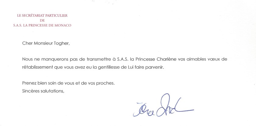 We will not fail to convey to H.S.H, Princess Charlene your kind wishes for recovery, which you have been kind enough to send to her.