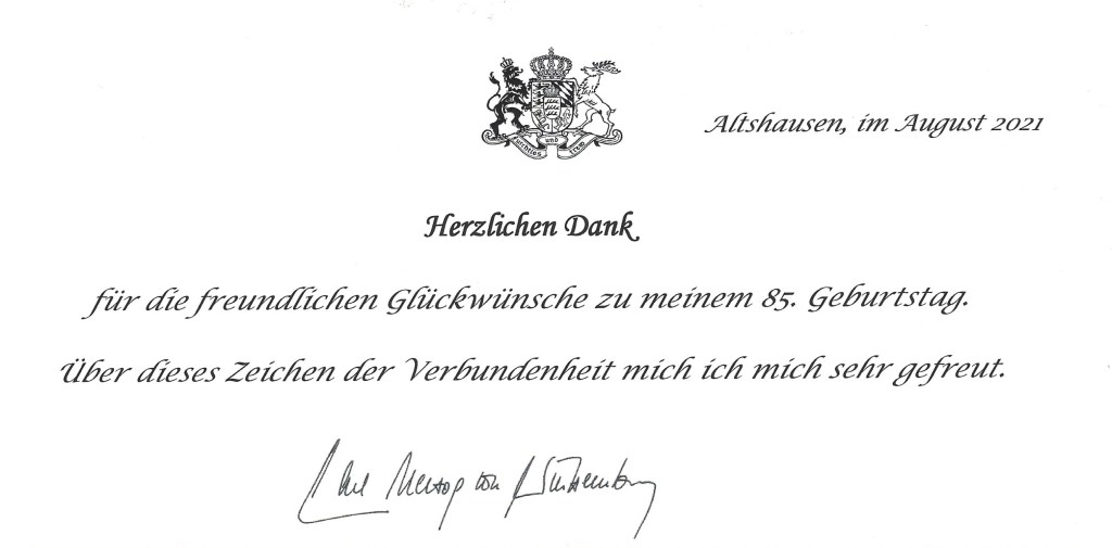 Royal response from His Royal Highness The Duke of Württemberg on the occasion of his 85th birthday.