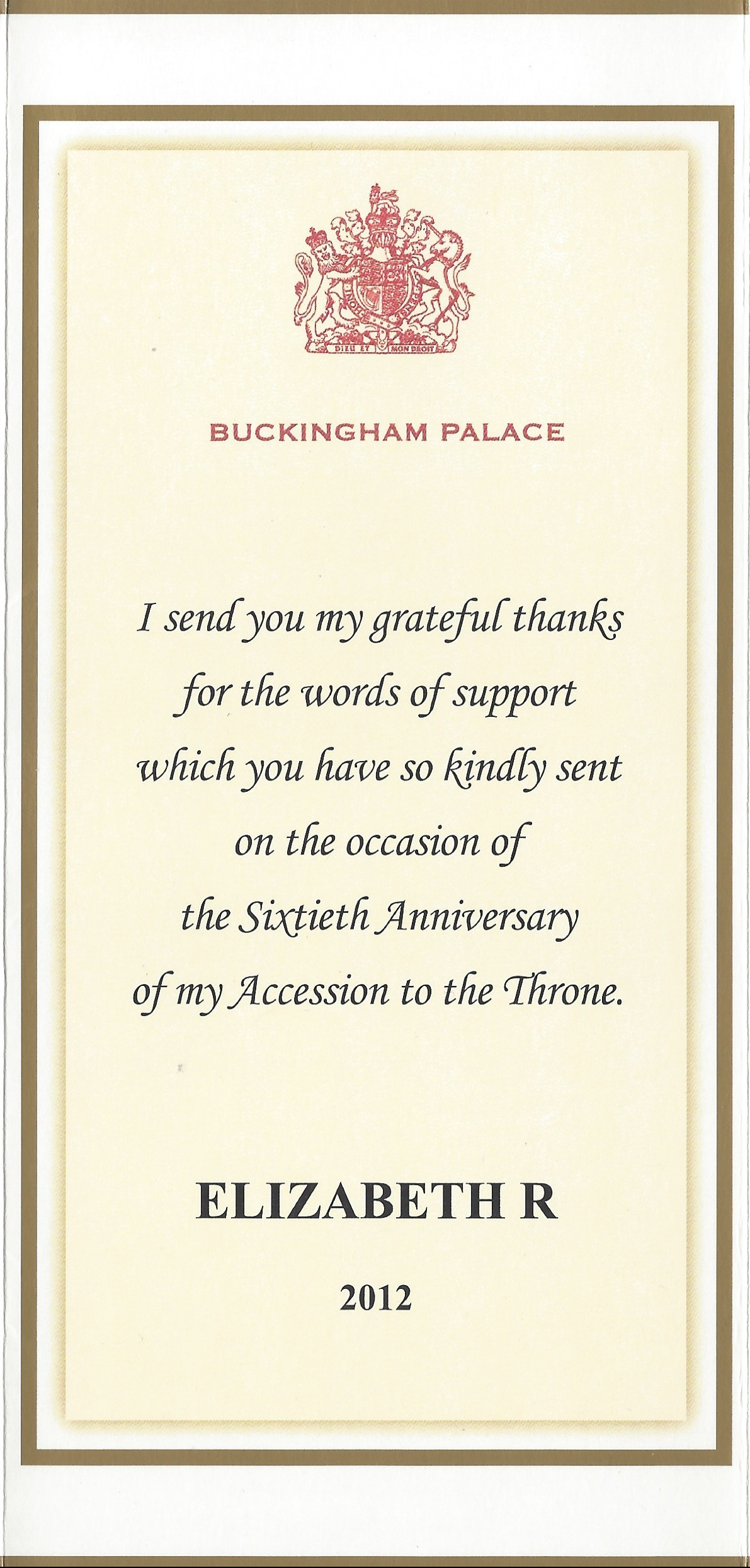 Royal response from Her Majesty The Queen on the occasion of her Diamond Jubilee of her accession to The Throne.