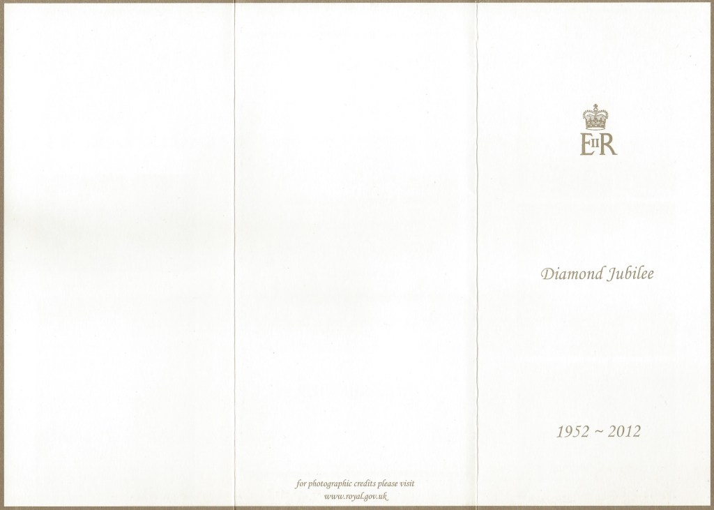 The reply is in the form of a card which on the front has Her Majesty’s Royal Cypher, mentions her Diamond Jubilee and has the dates of her reign, inside features six pictures of Her Majesty one from each decade of her reign and a message thanking me for my wishes to Her Majesty.