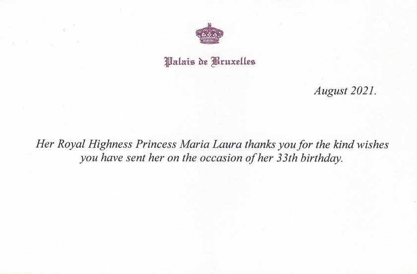 Royal response from Her Imperial and Royal Highness Princess Maria Laura of Belgium, Archduchess of Austria-Este on the occasion of her 33rd Birthday.