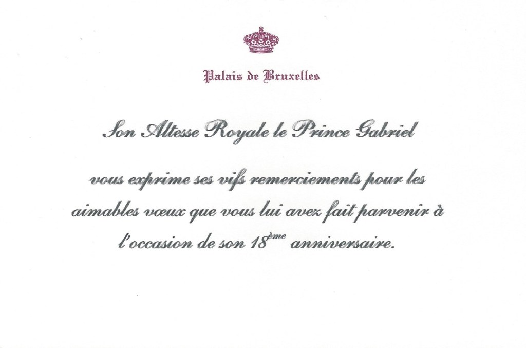 Royal response from His Royal Highness Prince Gabriel of Belgium on the occasion of his 18th birthday.