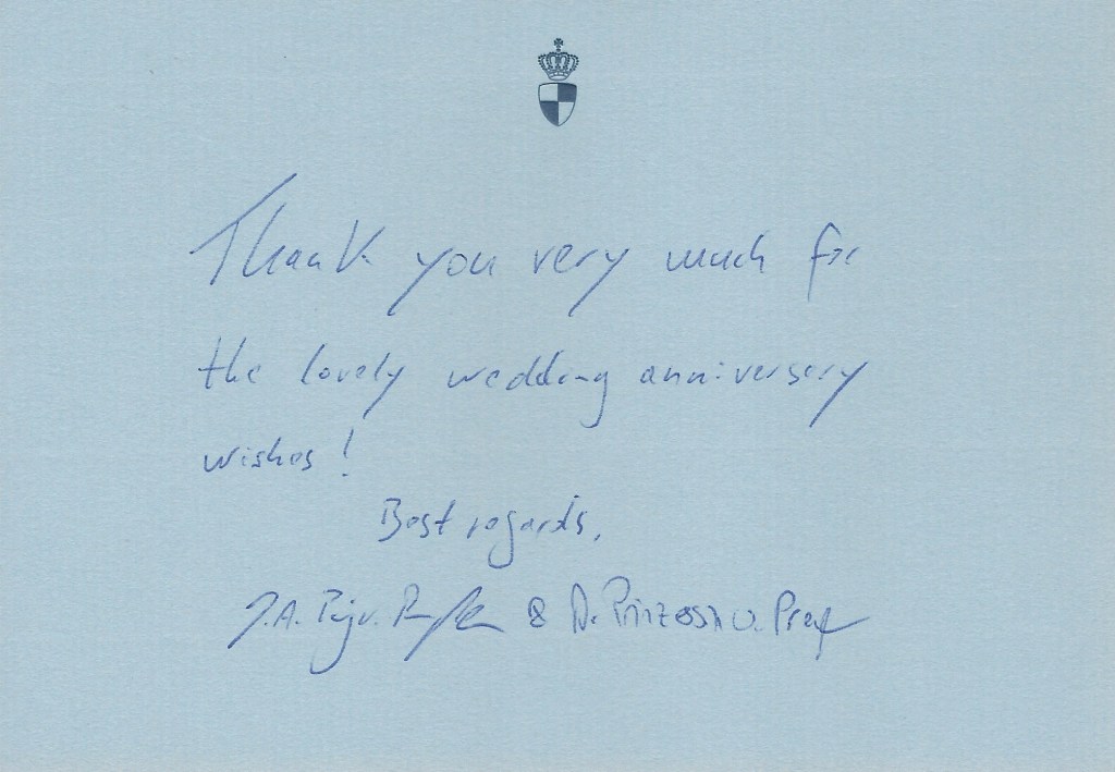 The reply is in the form of a note card thanking me for good wishes on their anniversary and is hand signed by Their Imperial and Royal Highnesses.