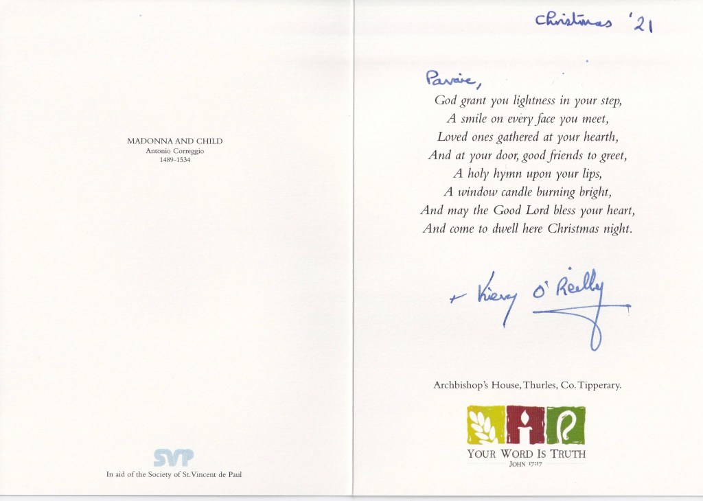Response from His Excellency Kieran O’Reilly, The Archbishop of Cashel and Emily on the occasion of Christmas 2021 and the New year 2022.