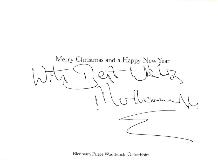 The reply is in the form of a card which on the front has a picture of a Winter Scene of The South Side of Blenheim Palace, inside signed by His Grace.