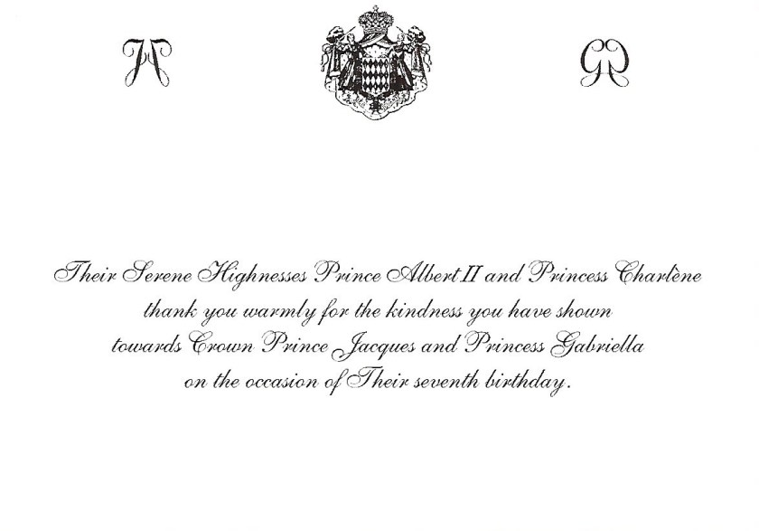 Royal response from Their Serene Highnesses The Prince and Princess of Monaco on the seventh birthday of their children Their Serene Highnesses Jacques, Hereditary Prince of Monaco, Marquis of Baux and Princess Gabriella, Countess of Carladès.