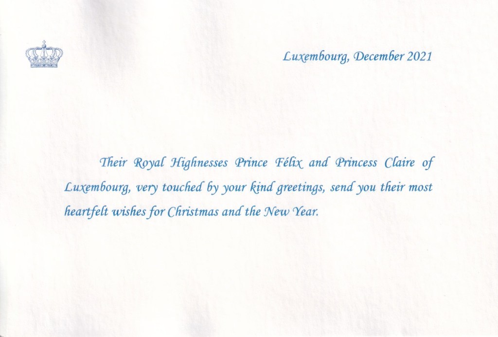 Royal response from Their Royal Highnesses Prince Felix and Princess Claire of Luxembourg and their two children Princess Amalia and Prince Liam of Luxembourg on the occasion of Christmas 2021 and the New Year 2022.
