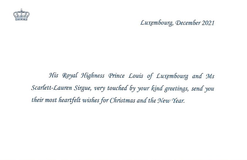 Royal response from His Royal Highness Prince Louis of Luxembourg and Miss Scarlett-Lauren Sirgue on the occasion of Christmas 2021 and the New Year 2022.