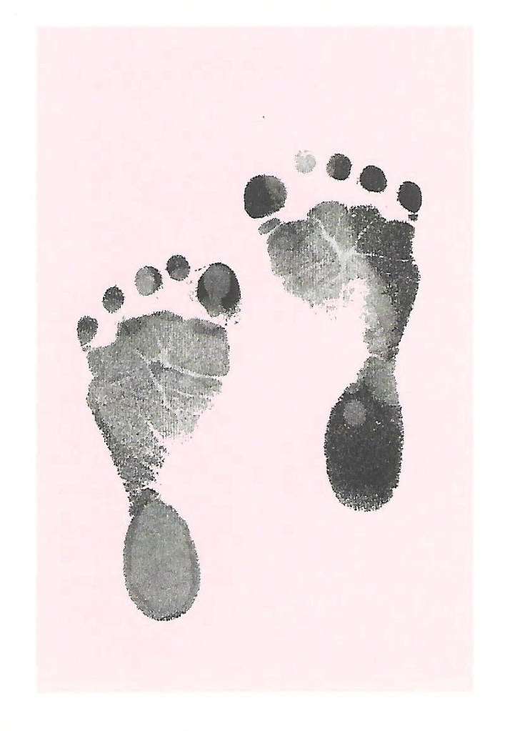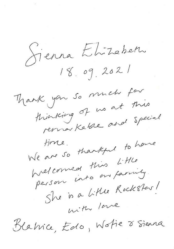 The reply is the form of a card which on the front has the image of an inking of baby Sienna’s feet on a pink background and on the reverse is a printed copy of a handwritten message thanking me for my wishes on the birth of their daughter and has their printed signatures as well as Edo sons Wolfie.