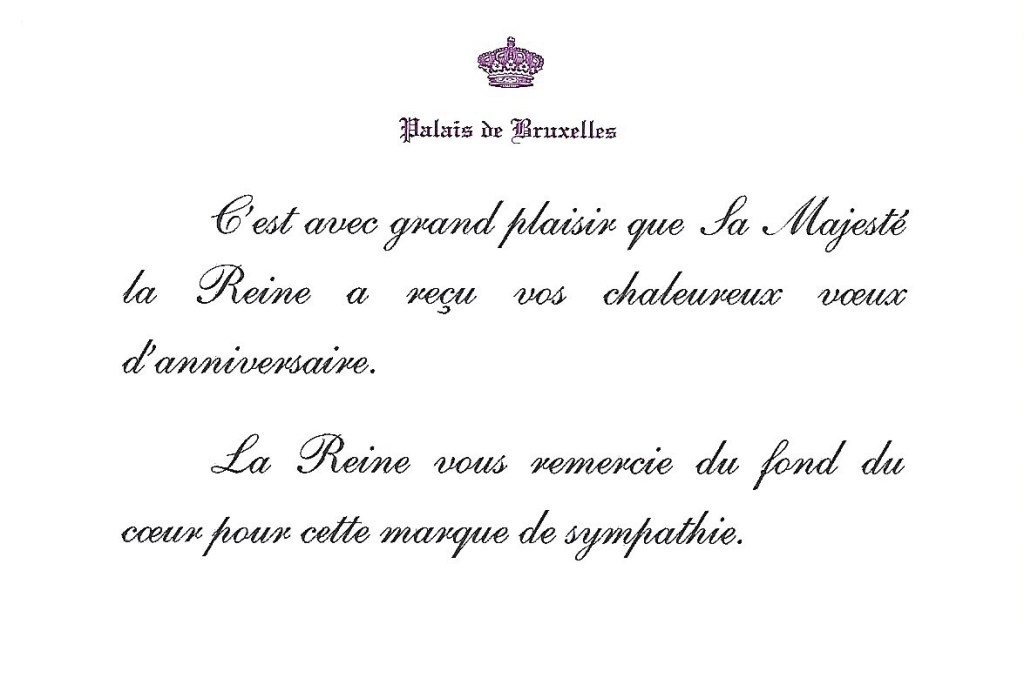 Royal response from Her Majesty The Queen of The Belgians on the occasion of her 44th birthday.