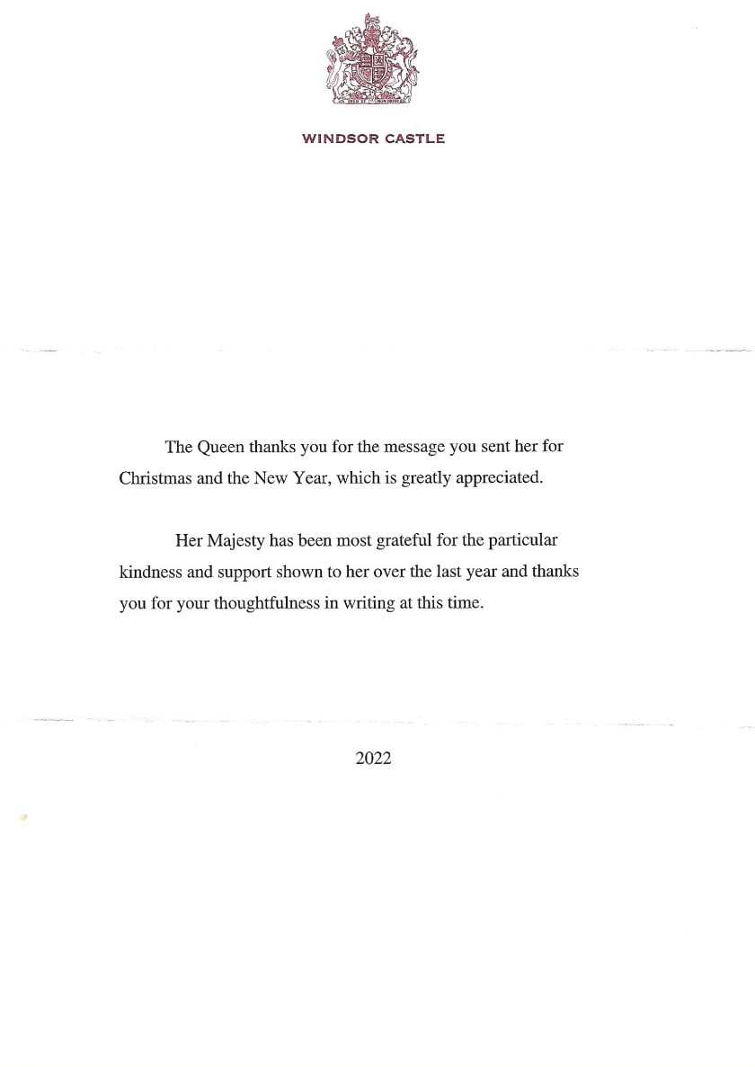 The reply is in the form of a letter thanking me for my Christmas wishes and wishing me the best, the letter was sent from Windsor Castle.