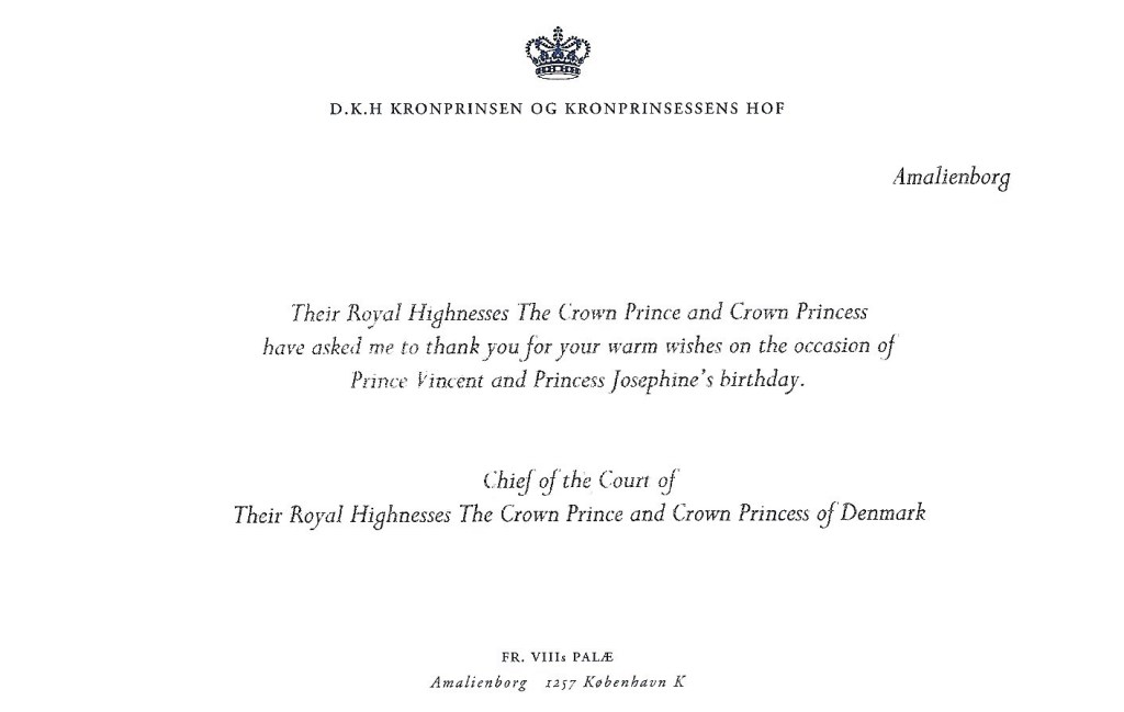 Royal response from Their Royal Highnesses The Crown Prince and Crown Princess of Denmark on the occasion of their children Their Royal Highnesses Prince Vincent and Princess Josephine of Denmark’s 11th birthday who are twins.
