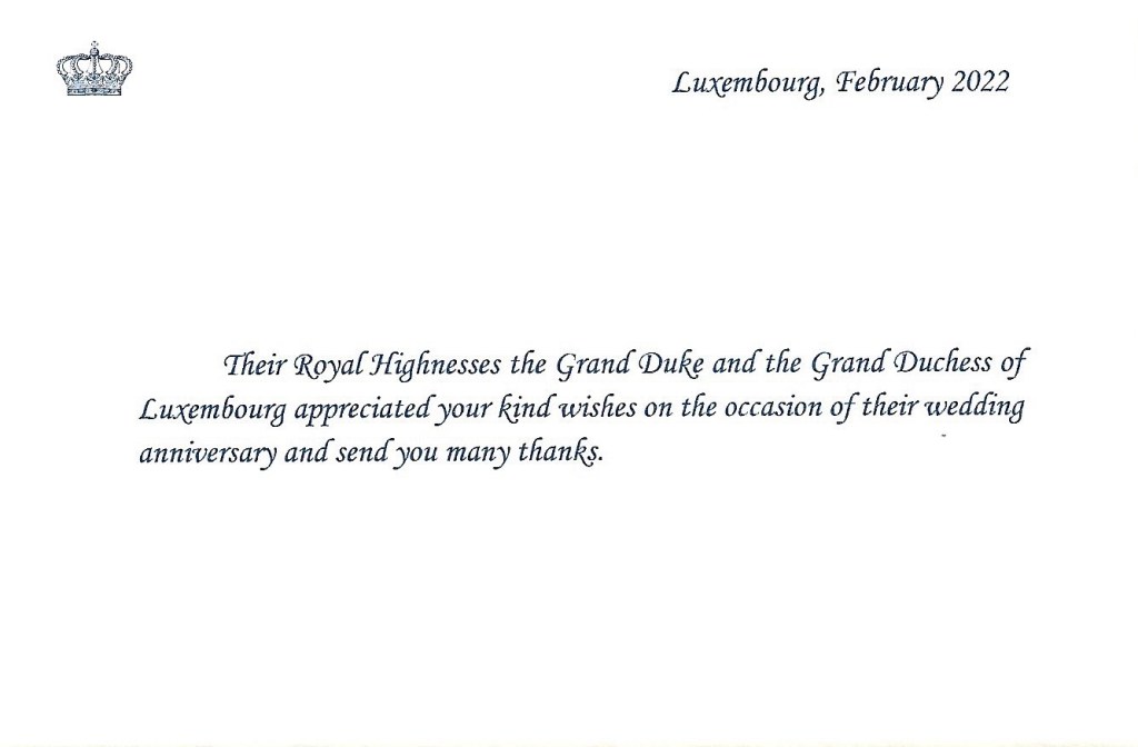 Royal response from Their Royal Highnesses The Grand Duke and Grand Duchess of Luxembourg on the occasion of their 41st wedding anniversary.