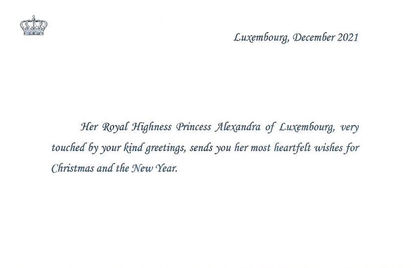 Royal response from Her Royal Highness Princess Alexandra of Luxembourg on the occasion of Christmas 2021 and the New Year 2022.