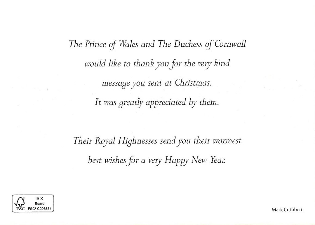 Royal response from Their Royal Highnesses The Prince of Wales and The Duchess of Cornwall on the occasion of Christmas 2014 and The New Year 2015.