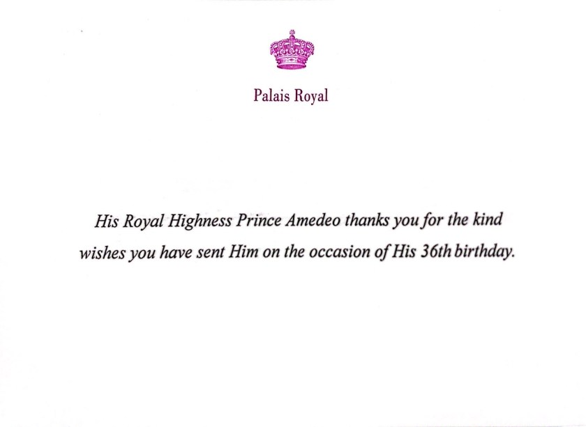 The reply is in the form of a card thanking me for my wishes for Prince Amedeo’s Birthday.