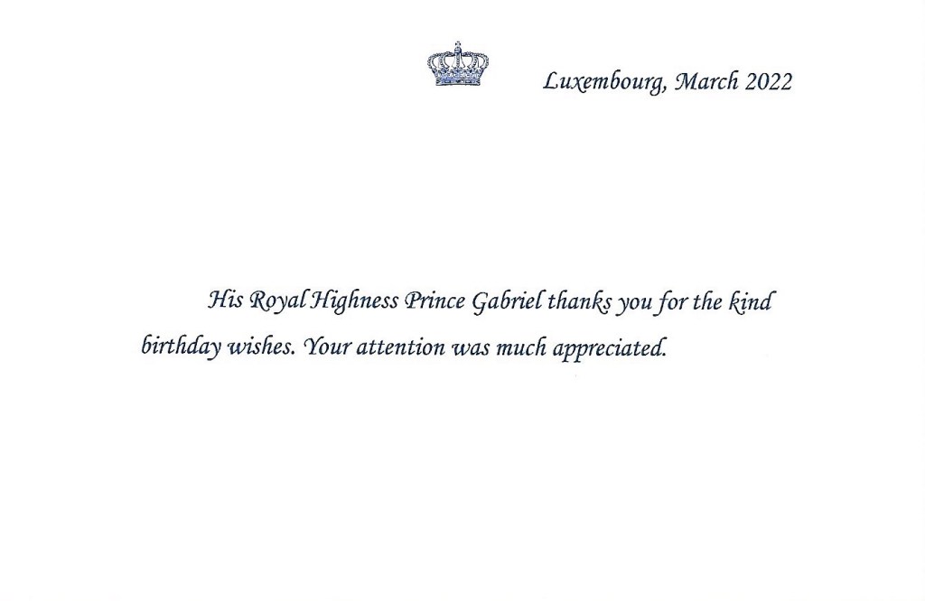 Royal response from His Royal Highness Prince Gabriel de Nassau on the occasion of his 16th birthday.