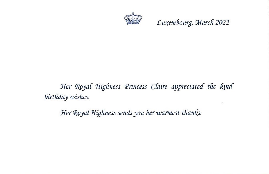 Royal response from Her Royal Highness Princess Claire of Luxembourg on the occasion of her 37th birthday.