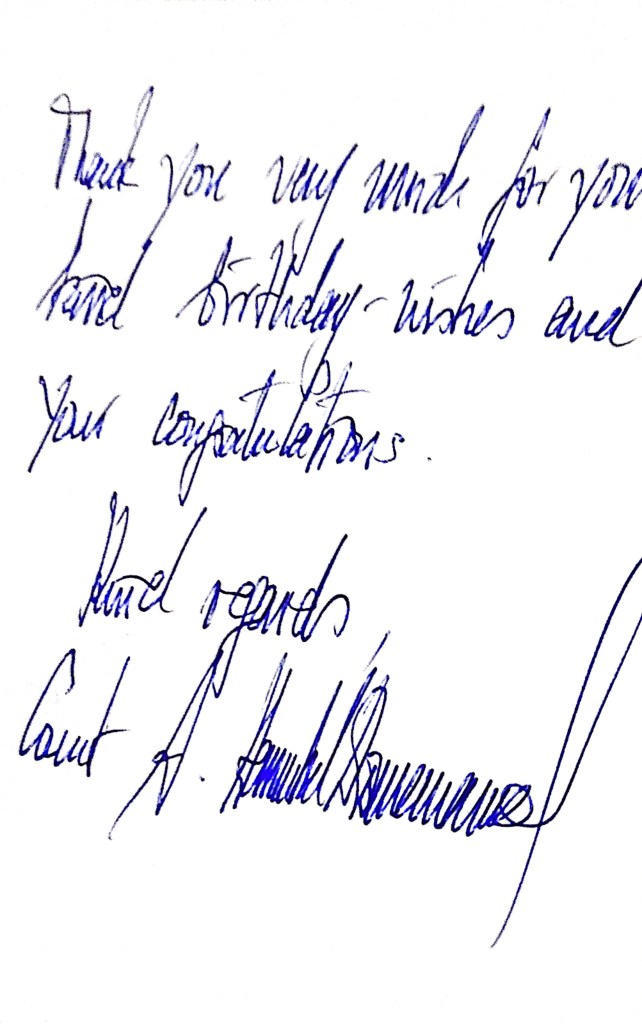 The reply is in the form of a card with a hand written message in English thanking me for my birthday wishes.