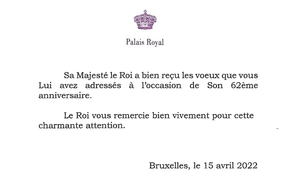 Royal response from His Majesty The King of The Belgians on the occasion of his 62nd birthday.
