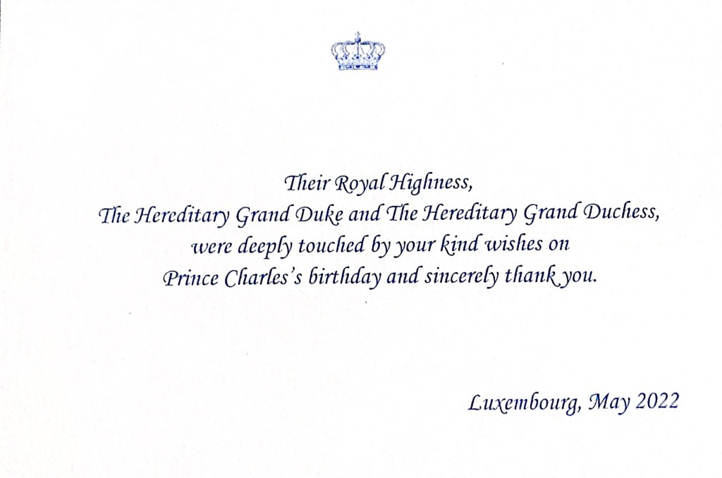 Royal response from Their Royal Highnesses The Hereditary Grand Duke and Hereditary Grand Duchess of Luxembourg on the occasion of their son His Royal Highness Prince Charles of Luxembourg’s 2nd birthday.
