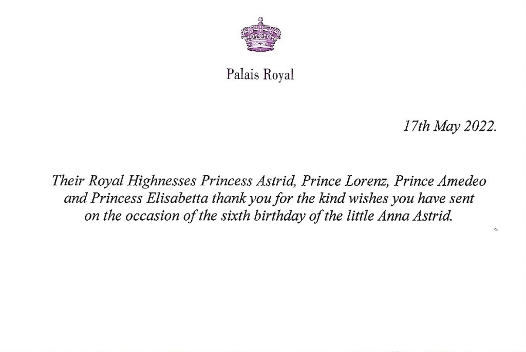 Royal response from Their Imperial and Royal Highnesses Prince Lorenz and Princess Astrid of Belgium, The Archduke and Archduchess of Austria-Este, Prince Amedeo and Princess Elisabetta of Belgium, Archduke and Archduchess of Austria-Este on the occasion of the 6th birthday of their granddaughter/daughter Her Imperial and Ropyal Highness Archduchess Anna Astrid of Austria-Este.