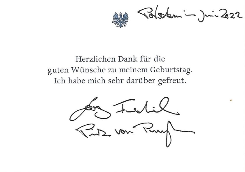 The reply is in the form of a card in German that thanks for my birthday wishes and is hand signed by His Imperial and Royal Highness.