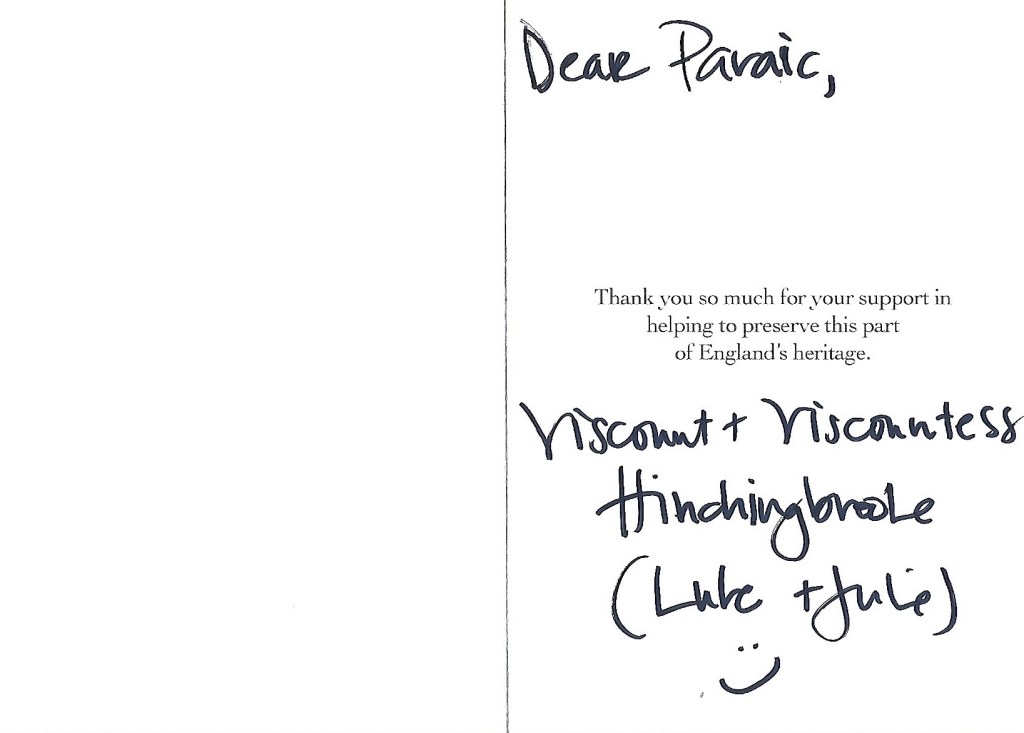 Response from The Honourable Luke and Julie Montagu, Viscount and Viscountess of Hinchingbrooke for been a Patreon on Mapperton Live.