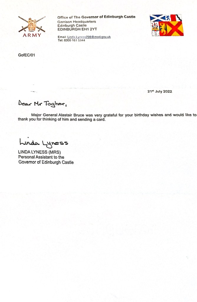 Response from Major General The Much Honoured Alastair Bruce of Crionaich OBE KStJ VR DL, Governor of Edinburgh Castle on the occasion of his 62nd birthday.