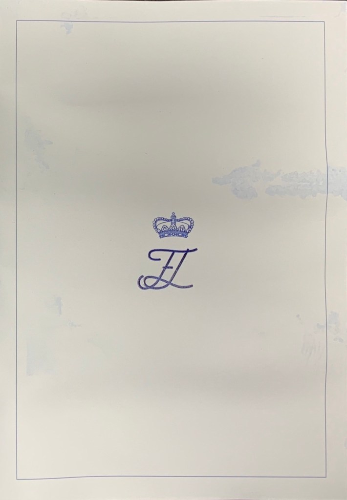 The reply is in the form of a card which on the front is the joint monogram of Their Royal Highnesses The Prince and Princess de Asturias and inside features a picture of Her Royal Highness Infanta Leonor of Spain who was standing in front of a fireplace and a message in Spanish and the printed signatures of Their Royal Highnesses.