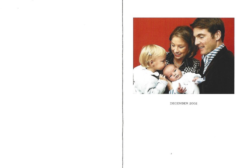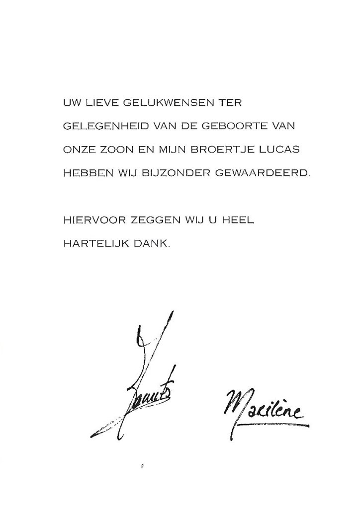 The reply is in the form of a card with a picture of Their Highnesses on the front with their newborn son Lucas and their daughter Anastasia and inside is a message in Dutch.