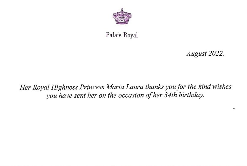 Royal response from Her Imperial and Royal Highness Princess Maria Laura of Belgium, Archduchess of Austria-Este on the occasion of her 34th Birthday.