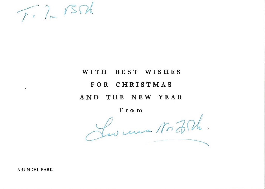 The reply is in the form of card which on the front has a watercolour of Arundel Park by Susan Cheney and inside is hand signed by The Dowager Duchess.