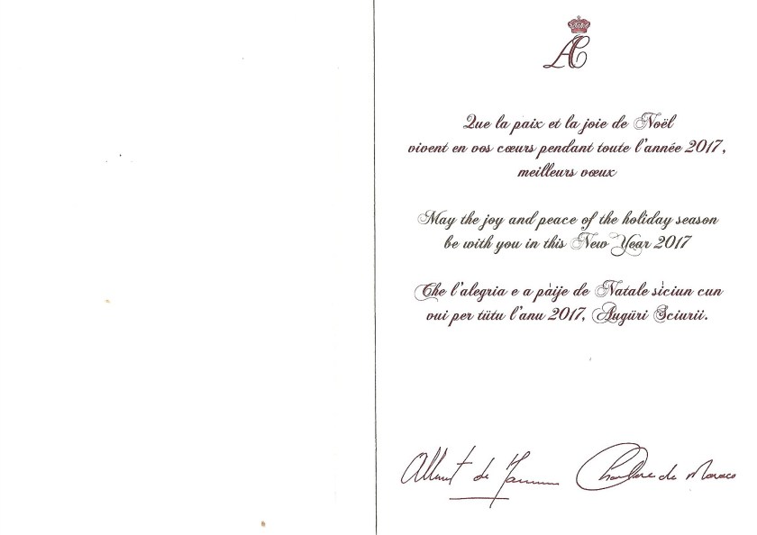 Royal response from Their Serene Highnesses The Prince and Princess of Monaco on the occasion of Christmas 2016 and the New Year 2017.
