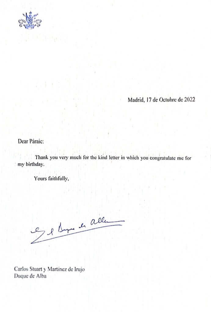 The reply is in the form of a letter thanking me for my birthday wishes and is handsigned by The Duke of Alba.