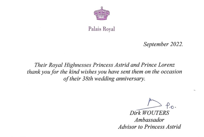 Royal response from Their Imperial and Royal Highness Prince Lorenz and Princess Astrid of Belgium, The Archduke and Archduchess of Austria-Este on the occasion of their 38th wedding anniversary.