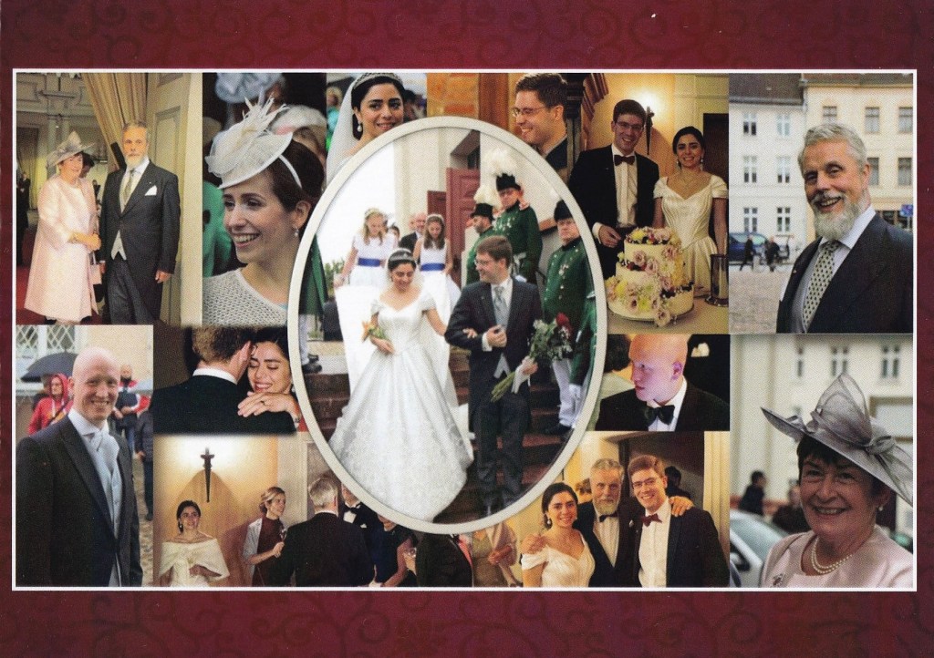 The reply is in the form of a card featuring multiple pictures from the wedding Their Highnesses Alexander and Hande, The Hereditary Prince and Hereditary Princess of Mecklenburg, Inside is a hand written message wishing me Merry Christmas and a Happy New Year and is hand signed by The Duke and Duchess.