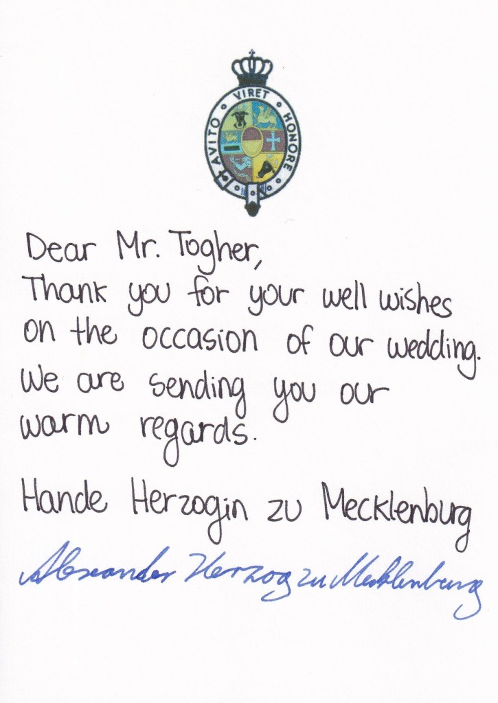 Royal response from Their Highnesses The Hereditary Prince and Hereditary Princess of Mecklenburg on the occasion of their wedding.