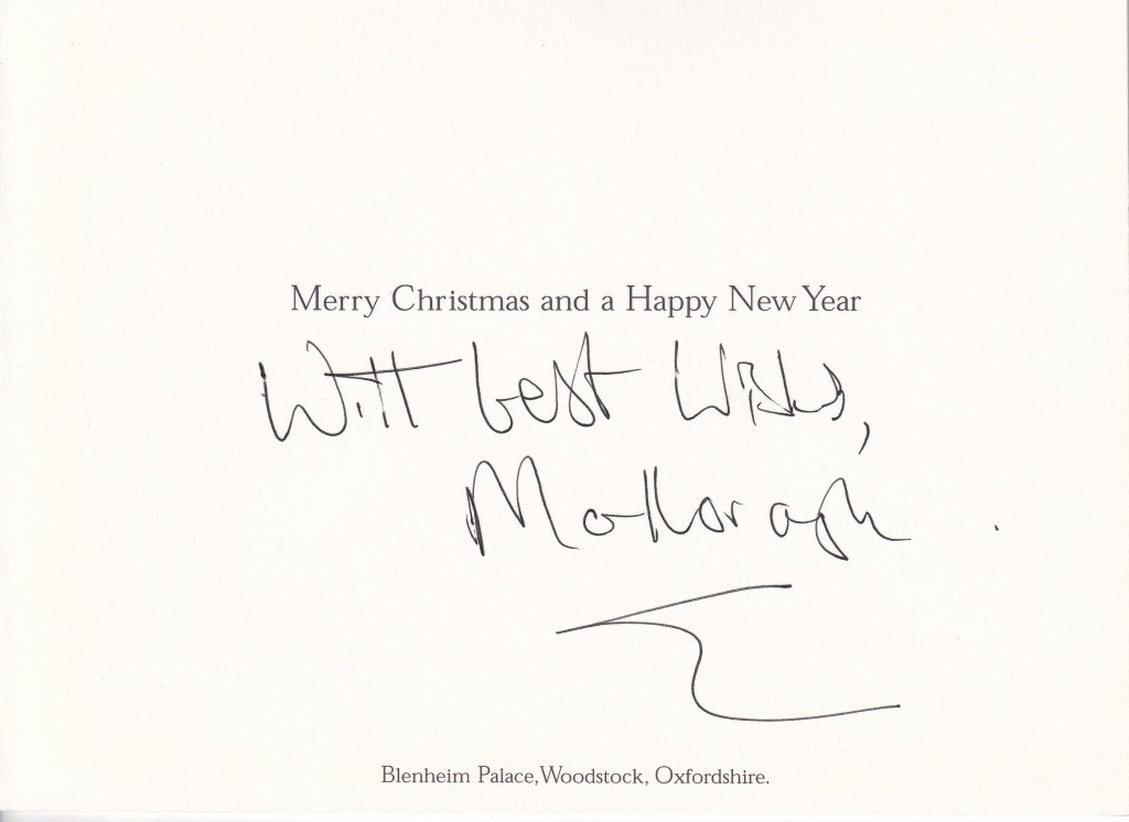 The reply is in the form of a card which on the front has a picture of a Winter Scene of The South Side of Blenheim Palace, inside signed by His Grace.