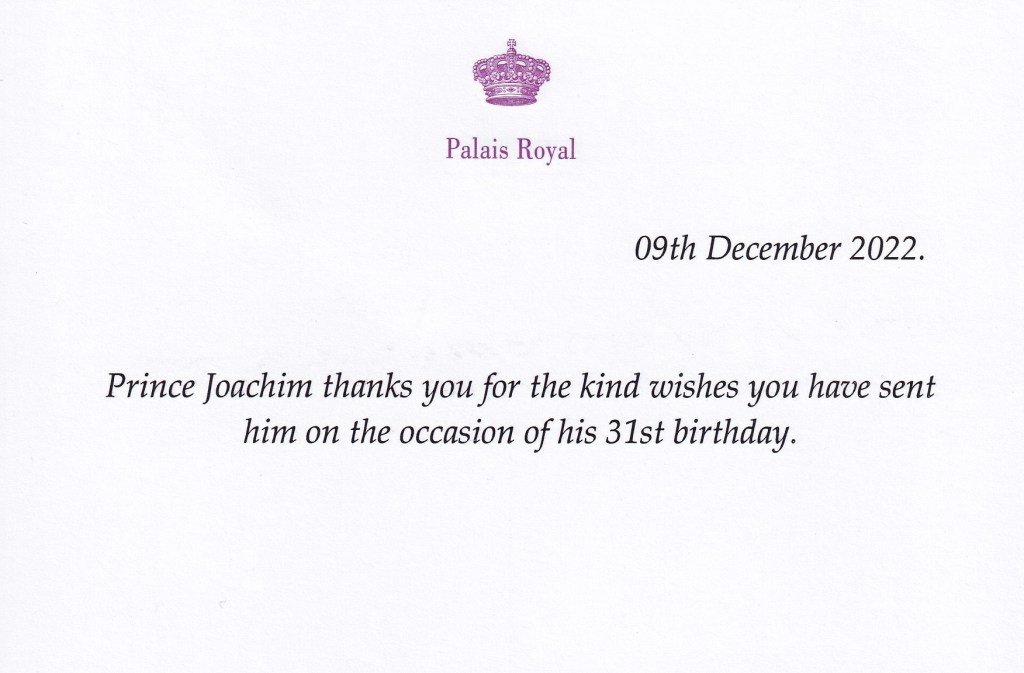 Royal response from His Imperial and Royal Highness Prince Joachim of Belgium, Archduke of Austria-Este on the occasion of his 31st birthday.