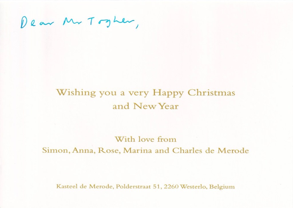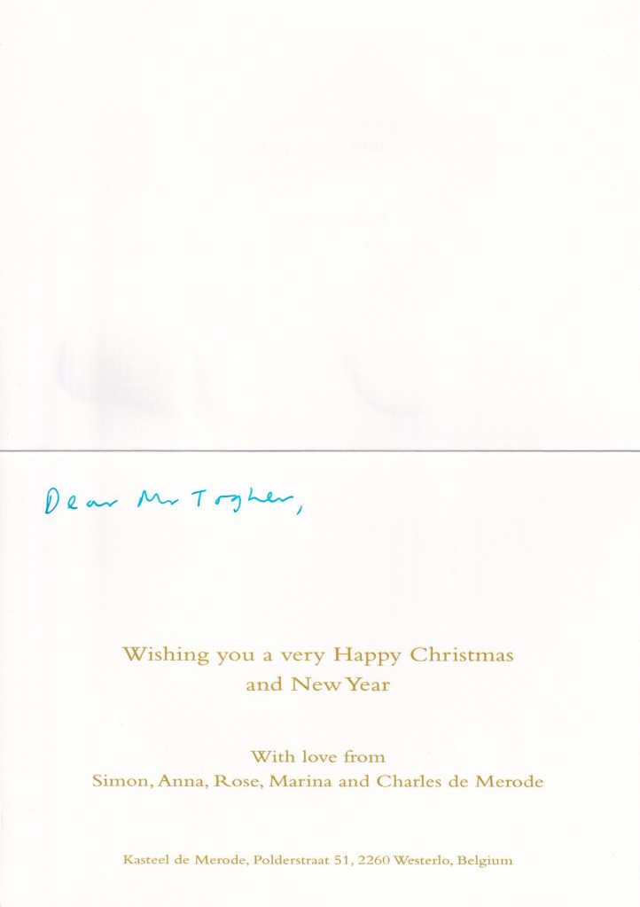 The card features a picture of the couple three children Rose, Marina and Charles in front Schloss Merode on the front, in the background you can see Simon and Anna de Merode. Insides bears a message of Merry Christmas and a Happy New Year.